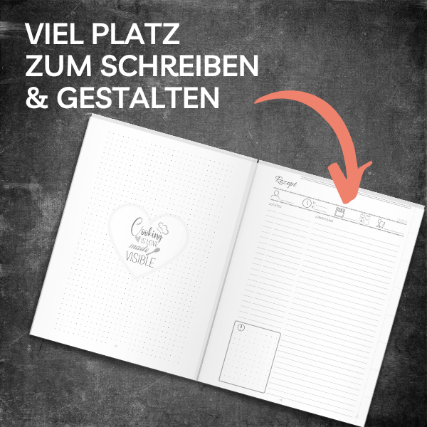 EXTRA VIEL PLATZ: dieses XXL Rezeptbuch hat 150 Seiten in der Größe DIN A4. 10 Doppelseiten davon sind für extra große Rezepte. Viel Platz zum Ausfüllen, Zeichnen, Einkleben und Verschönern der Seiten.