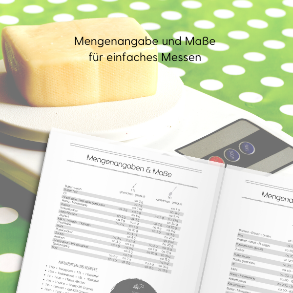 IDEALE HILFE: Inhaltsverzeichnis mit Seitenangabe und Kategorie zum Ausfüllen – Doppelseite mit Mengenangaben und Maße für Löffel und Tassen – Umrechnung Fahrenheit/Celsius – Register zum selber erstellen, gestalten und ausschneiden.
