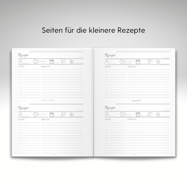 DEINE REZEPTE: in diesem liebevoll gestalteten Hardcover Rezeptbuch ist Platz für insgesamt 120 deiner Rezepte – kleine, große oder extra große Rezepte – geeignet für Koch- und Backrezepte